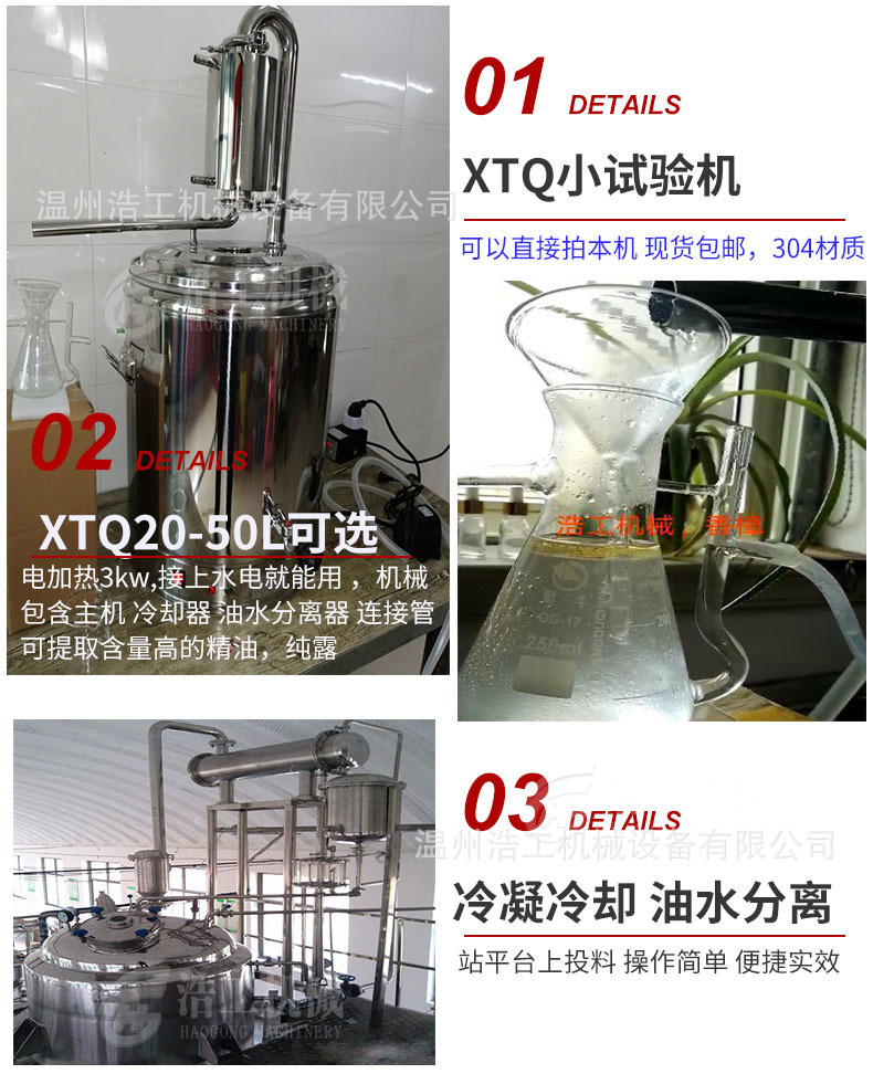 设备采用电加热、对溶剂和挥发油进行回收,回收过程经冷凝器冷却回收溶剂和挥发油,回收效率高,油水分离器提纯净效果好,全套整机待发、安装简单、接上水电就可以使用、是广大用户选择产品。
